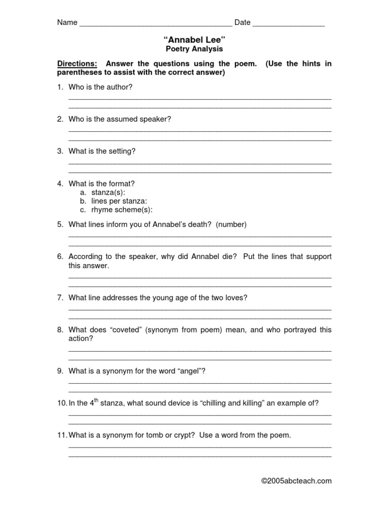 Annabel lee poetry poe questions abcteach poem analyze students worksheets middle template teaching text regarding form help grade writing. Annabel Lee is the last complete poem published by Poe before his death. How do lines 7 and lines 27-29 reflect the reality of the relationship between Edgar.